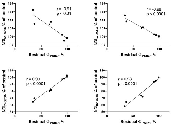 To quantitatively assess the applicability of DS plants’ NDIs normalized to control as indicators of the residual photosynthetic activity levels, correlation analyses of the relationships between these values were performed for the NT, MT, HT, and HHT groups on days 5 and 10 of drought (Figure 10). All NDIs showed high correlation with the residual ΦPSII; NDI610/450 showed the lowest degree of association with the residual ΦPSII (r = −0.91, p < 0.01 and NDI740/700 showed the highest (r = 0.99, p < 0.0001).