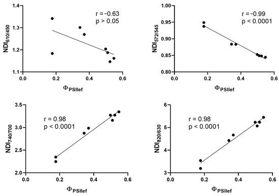 The next step was to analyze the possibility of using absolute values of NDIs of stressed plants to directly assess the current level of photosynthetic activity under drought stress. This approach eliminates the need for a control group of plants to perform the analysis (Figure 11). Correlation analysis of the relationship between absolute values of NDIs and ΦPSII of plants subjected to 5- and 10-day soil drought showed a strong statistically significant relationship of the studied values. The indices NDI572/545, NDI740/700, and NDI820/630 showed a high correlation with ΦPSII in DS conditions; however, no statistically significant relationship was shown in the case of NDI610/450 (r = −0.63, p > 0.05).