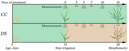 Experiment design. CC—control group, DS—drought stress treatment, HSI—hyperspectral imaging, ChlF—chlorophyll fluorescence imaging.
