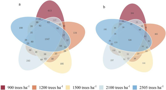 Venn diagrams of soil bacteria (a) and fungi (b) in Chinese fir plantations with different stand densities.