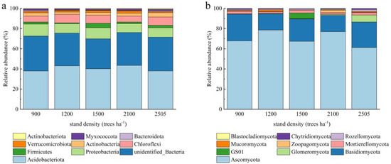 Effect of different stand densities of Chinese fir on relative abundance at the level of bacterial (a) and fungal (b) phyla.