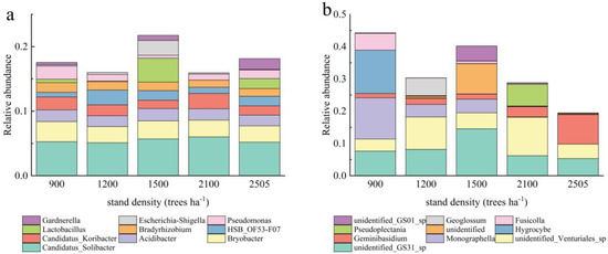 The effect of different stand densities of Chinese fir on the relative abundance of bacteria (a) and fungi (b) at the genus level.