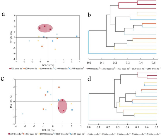 PCA analysis and hierarchical cluster analysis of soil microorganisms. The bacterial PCA analysis (a); the bacterial hierarchical cluster analysis (b); the fungal PCA analysis (c); the fungal hierarchical cluster analysis (d). Significant clustering was observed at a stand density of 900 trees ha−1, with ellipses highlighted.