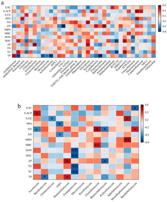 Correlation analysis between soil microbial communities and environmental factors in different stand densities. The bacterial (a) and fungal (b) communities. AN: ammonia nitrogen; NN: nitrate nitrogen; MBC: microbial biomass carbon; MBN: microbial biomass nitrogen; DOC: dissolved organic carbon; DON: dissolved organic nitrogen; PPO: polyphenol oxidase; S.UE: soil urease; S.ACP: soluble acid phosphatase; S.SC: soil sucrase (the same below). * denotes significant, ** denotes highly significant.
