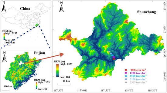 This experimental area is located in the Banqiao Work Area of Yangkou State Forestry Farm, Fujian Province, China, with the geographic coordinates of 117°54′26″ E and 26°47′43″ N. The region has a subtropical monsoon climate with long hours of sunshine, with an average annual sunshine duration of about 1700 h and a frost-free period of about 300 days. The average annual temperature is 18.8 °C, and the average annual precipitation is about 1700 mm (Figure 6). The study area is located on the southern slope of the mountain, with an average slope of 30 degrees. The soil type is a mountainous red loam with a high organic matter content, a depth of more than 90 cm, an acidic pH, and a stand index of 18. The Chinese fir plantation forests in the region have been established for more than 20 years, and fir is a fast-growing timber species. According to the land use classification, the area is classified as a plantation timber forest. Understory-associated vegetation is dominated by Ficus hirta, Dicranopteris dichotoma, Maesa japonica, Oreocnide frutescens, Diplazium metteniamum, Pteris fauriei, and so on. The experimental forest was established in 2008 using “020” asexual seedling cuttings at a density of 3300–3600 trees ha−1. In the cultivation of medium-diameter or large-diameter fir, the initial planting density is usually set at 3300–3600 trees ha−1, and after 4–6 years, inter-planting is carried out. In March 2013, the forest underwent thinning to optimize the stand structure. The growth of fir trees in 15 sample plots of fir plantation forests was investigated (Table 3), and we calculated the mean and standard deviation and found that there was no significant difference in the growth of fir trees of different densities.