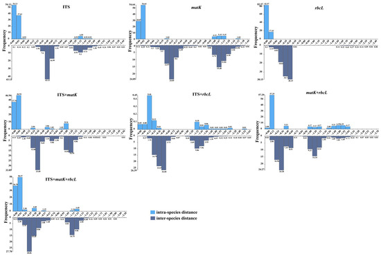 Barcoding gaps of each single candidate barcode and their combination markers based on intra- and inter-specific distances for species. Among them, there are 215 sequences of ITS sites (109 sequences in this study, 106 NCBI sequences downloaded), 216 sequences of matK sites (109 sequences in this study, 107 NCBI sequences downloaded), and 215 sequences of rbcL sites. (109 sequences in this study, 106 NCBI sequences downloaded), a total of 215 sequences of ITS + matK sites (109 sequences in this study, NCBI sequence download 106), ITS + rbcL site 216 sequences (109 sequences in this study, NCBI sequence download 107), matK + rbcL site 215 sequences (109 sequences in this study, NCBI sequence download 106 bar), a total of 214 sequences of ITS + matK + rbcL sites (109 sequences in this study, 105 NCBI sequences downloaded). Please see the Table S2 for detailed download sequences.