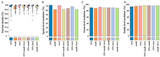Species discrimination based on the similarity-based method (BLAST). (A) Pairwise identification success for each locus and multi-loci markers in this study. (B–D) Identification success rates at the species level, genus level, and family level using BLAST.
