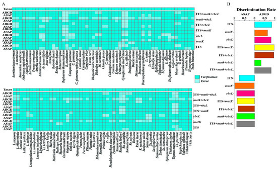 Species delimitation determined by ABGD and ASAP methods. (A) Taxon: morphological identification. (B) Species discrimination rates based on ABGD and ASAP. The delimited MOTUs by ABGD and ASAP analyses are shown.
