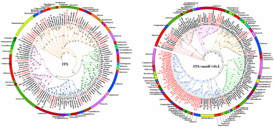 A phylogenetic tree’s construction and the evaluation of monophyly rates based on molecular data represent the simplest approach to gauge a species’ DNA barcode’s ability to discriminate [40]. To enhance the reliability and accuracy of species identification, we constructed trees using maximum likelihood (ML) for each candidate barcode, along with the highest-hit sequences obtained from BLASTn in GenBank. The inferred distance-based species phylogenetic tree is illustrated in Figure 5 and Supplementary Figure S1. The species trees from various sites were well-resolved and demonstrated strong support, with the majority of branches exhibiting maximum support values. This finding aligns with traditional taxonomic classification methods. In particular, clustering was tighter for single barcodes than for combinations of barcodes. Additionally, several Lamiaceae species were observed to be sister taxa to species from other families in all trees (Figure 5 and Figure S1). To further investigate species monophyly at each sampled locus and at the combined loci, we tested the conspecific clusters of the species. The results revealed that most species were conspecific clusters at all or almost all loci, 70.30% of species were conspecific clusters at ITS loci, which were 62.38% at matK locus, and 59.41% at the rbcL locus. Notably, the monophyly rate for combined loci was lower than that for individual loci, with the following proportions: 32.67% (ITS + matK), 38.61% (ITS + rbcL), 39.60% (matK + rbcL), and 26.73% (ITS + matK + rbcL) (Table S6). However, the clustering of the seven trees highlighted significant taxonomic inconsistencies. All single-locus phylogenetic trees were more effective at forming conspecific clustered branches, demonstrating strong species discrimination. A comparison of phylogenetic trees based on various gene combinations revealed confusion and inconsistency in species identification across this diverse set of species. These findings further confirm that an in-depth exploration of the phylogenetic signals from different genomic regions across multiple species can elucidate the complex evolutionary history and relationships among species. Therefore, it is essential to establish a regional database of medicinal plant DNA information that covers a broader range of species.