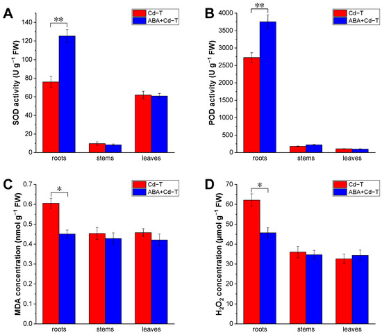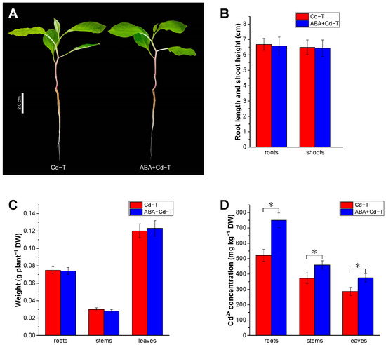 Roots, stems, and leaves were harvested from the Cd−T and ABA+Cd−T samples to measure their H2O2 concentration using a method previously described by Zhang et al. [71]. The tissues collected from four seedlings were mixed into one sample (one biological replicate); each experiment included three biological replicates, and each biological replicate consisted of three technical replicates.