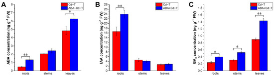 The results demonstrated that exogenous ABA application increased the endogenous ABA and GA3 concentrations in the roots, stems, and leaves, as well as the endogenous IAA concentration in the roots. Additionally, in the ABA+Cd−T samples, the ratio of ABA/IAA in the roots was 0.056 (1.33/23.92), which was higher than that of 0.029 (0.48/16.63) in the Cd−T samples. In addition, the ratio of ABA/GA3 in the roots of the ABA+Cd−T samples was 3.33 (1.33/0.40), which was higher than that of 2.0 (0.48/0.24) in the Cd−T samples.