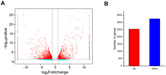 (A) Volcano analysis of DEGs. Red dots represent significant change; green dots represent non-significant change; gray dots represent no significant change. (B) Statistics of up- and down-regulated DEGs. Red column represents up-regulated and blue column represents down-regulated.