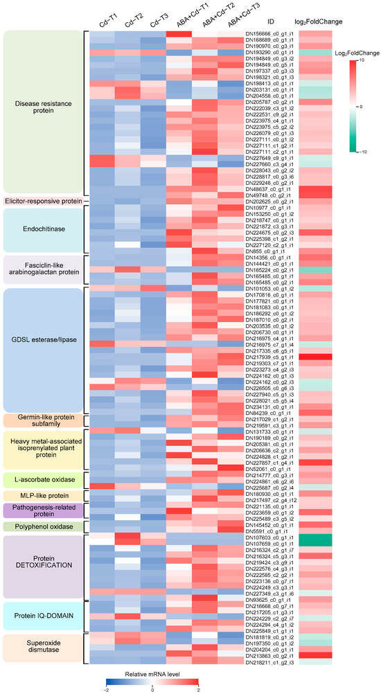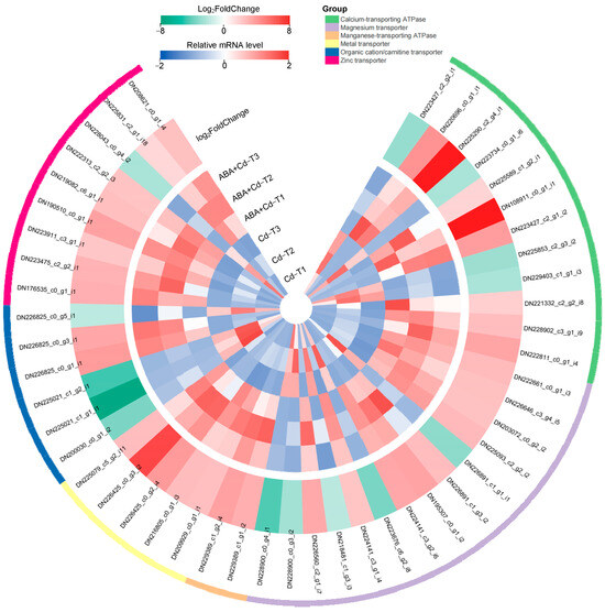 Metal transport is an important biological process for Cd accumulation in plants [21]. This study observed a higher Cd2+ concentration in the roots, stems, and leaves of ABA+Cd−T samples than in Cd−T samples. Transcriptome analysis found 96 common metal transport-related DEGs (73 up-regulated and 23 down-regulated) between the ABA+Cd−T and Cd−T samples. Their expression profiles are shown in Figure 5 and Table 2. Among the 96 DEGs, there were 12 calcium-transporting ATPase DEGs (eight up-regulated and four down-regulated), 14 magnesium (Mg) transporter DEGs (nine up-regulated and five down-regulated), two Mn-transporting ATPase up-regulated DEGs, five metal transporter up-regulated DEGs, six organic cation/carnitine transporter DEGs (two up-regulated and four down-regulated), nine zinc transporter DEGs (eight up-regulated and one down-regulated), and 48 ABC transporter DEGs (39 up-regulated and nine down-regulated).