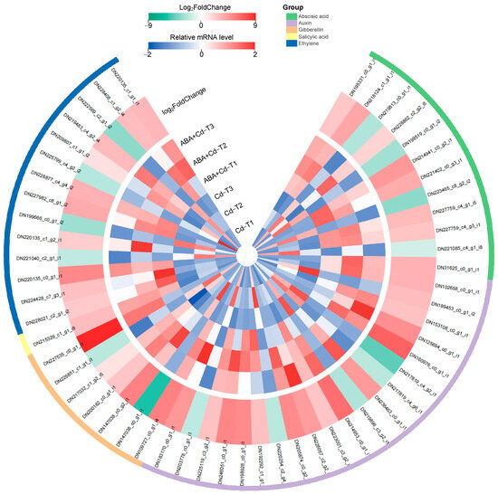 Meanwhile, transcriptome analysis found 54 phytohormone-related DEGs among the ABA+Cd−T and Cd−T samples, which were associated with ABA, IAA, GA, and ethylene, suggesting that the phytohormone signal transduction pathway positively responds to Cd stress.