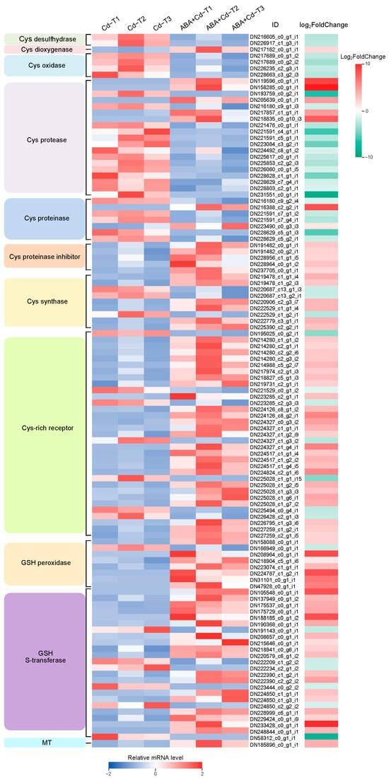In the cysteine (Cys) synthesis and metabolism pathway, two Cys desulfhydrase down-regulated DEGs, one Cys dioxygenase up-regulated DEG, four Cys oxidase down-regulated DEGs, and nine Cys synthase DEGs (six up-regulated and three down-regulated) were found, suggesting that exogenous ABA application increased the chelation of Cys and Cd by modulating Cys synthesis and metabolism in the P. acinosa roots. Meanwhile, 19 Cys protease DEGs (five up-regulated and 14 down-regulated), seven Cys proteinase DEGs (two up-regulated and five down-regulated), five Cys proteinase inhibitor up-regulated DEGs, and 33 Cys-rich receptor DEGs (26 up-regulated and seven down-regulated) were found. These findings indicate that the synergistic effect of Cys protease, Cys proteinase, and Cys protease inhibitor regulated the response of P. acinosa to Cd stress under exogenous ABA application. In addition, eight glutathione (GSH) peroxidase DEGs (seven up-regulated and one down-regulated) and 24 GSH S-transferase DEGs (18 up-regulated and six down-regulated) were identified, indicating that under exogenous ABA application, GSH peroxidase and GSH S-transferase may also be important for P. acinosa responses to Cd stress.