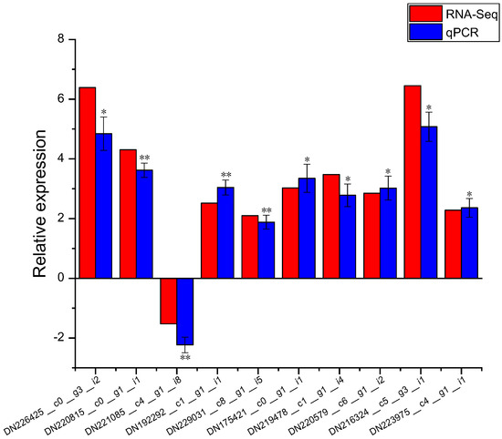 Expression patterns of 10 DEGs confirmed by real-time PCR (log2Foldchange levels). Data are shown as means ± SD of three biological replicates. Based on Dunnett’s test, * represents p < 0.05, ** represents p < 0.01.