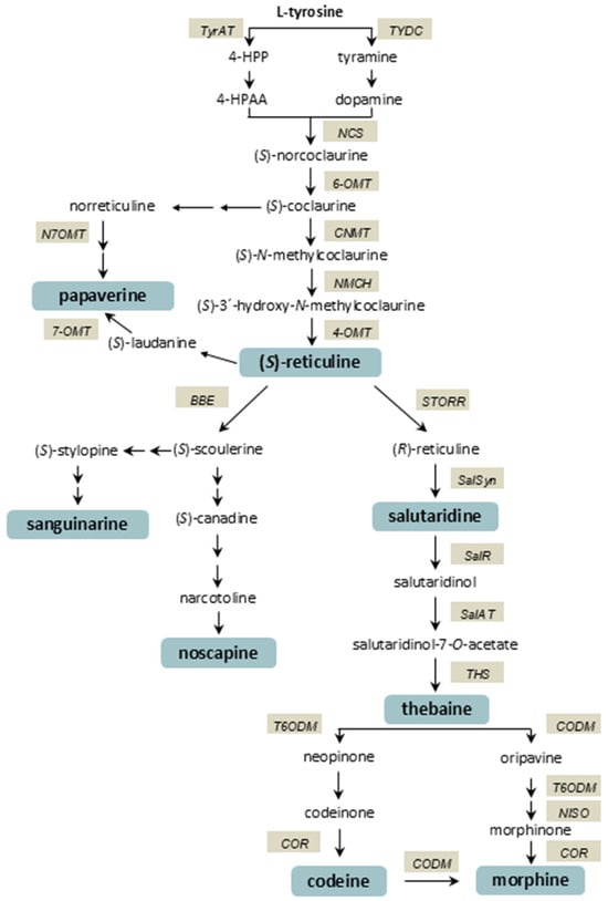 The biosynthesis of BIAs in opium poppy follows a complex, highly branched pathway (Figure 1) that begins with the amino acid L-tyrosine [11]. In the early stages of the biosynthetic pathway, tyrosine decarboxylase (TYDC) and norcoclaurine synthase (NCS) catalyse the formation of (S)-norcoclaurine, the first committed intermediate in BIA biosynthesis. Through a series of methylation and hydroxylation reactions catalysed by enzymes including norcoclaurine 6-O-methyltransferase (6-OMT), coclaurine N-methyltransferase (CNMT), and 4′-O-methyltransferase (4-OMT), the pathway leads to the formation of (S)-reticuline, a crucial branch-point intermediate. From (S)-reticuline, various end products are formed via different branches, including the noscapine, papaverine, and morphinan pathways. The initial step in the formation of the phthalideisoquinoline alkaloid noscapine is the conversion of (S)-reticuline to (S)-scoulerine by berberine bridge enzyme (BBE) [12]. (S)-scoulerine is converted to noscapine via eleven steps [13]. (S)-reticuline can be converted to papaverine in several steps involving (R,S)-reticuline 7-O-methyltransferase (N7OMT), forming the papaverine branch. The morphinan branch pathway begins with the conversion of (S)-reticuline to (R)-reticuline by an enzyme known as STORR (S-to-R reticuline) [14,15]. This is followed by the formation of salutaridine by salutaridine synthase (SalSyn). Reduction of the salutaridine is catalysed by salutaridine reductase (SalR), yielding salutaridinol. Salutaridinol is then acetylated on the resulting hydroxyl moiety by salutaridinol 7-O-acetyltransferase (SalAT) to produce the unstable intermediate salutaridinol 7-O-acetate, which was long thought to spontaneously convert to thebaine. However, it has recently been shown that the final step in thebaine biosynthesis is catalysed by thebaine synthase (THS) [16]. Thebaine is converted to morphine by a multistep bifurcated pathway. The major route involves the conversion of thebaine through several intermediates, including codeine. Codeinone reductase (COR) catalyses the reduction of codeinone to codeine. Finally, morphine is formed by codeine O-demethylase (CODM). The isolation of oripavine in an opium poppy led to the discovery of a second, minor route to morphine that bypasses codeinone and proceeds via morphinone [17,18]. Morphine and, to a lesser extent, codeine are the major products of the pathway in plants [19].