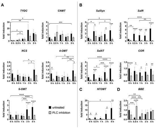 Temporal changes in relative gene expression of selected enzymes of BIA pathway following PLC inhibition in opium poppy (Papaver somniferum L.). The figure is divided into four groups, each representing a different branch of the BIA pathway. (A) (S)-reticuline pathway; (B) morphinan pathway; (C) papaverine pathway; (D) noscapine/sanguinarine pathway. Bar graphs represent fold changes normalised to the untreated and unwounded control at the time point set as 0 h (set to 1). The x-axis represents wounded plants, both untreated (black bars) and treated with PLC inhibitor (grey bars), collected at different time points (0.5 h, 1 h, 3 h and 5 h). Unwounded plants treated with PLC inhibitor (0 h) are shown for comparison to the untreated and unwounded control (0 h) to determine its individual effect on BIA biosynthesis. β-actin and EF1α were used as reference genes. Selected statistically significant differences are indicated by * (* p < 0.05, ** p < 0.01, *** p < 0.001, **** p < 0.0001).