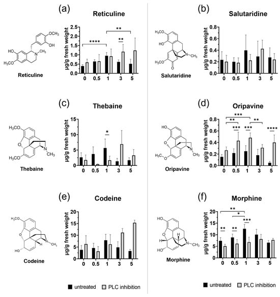 HPLC-MS analysis of benzylisoquinoline alkaloids. Changes in the formation of opium poppy alkaloids in untreated and inhibitor-treated opium poppy (Papaver somniferum L.) plants. Bar graphs show calculation in μg alkaloid/g fresh weight (y-axis) at different time points (0 h, 0.5 h, 1 h, 3 h, and 5 h) displayed on the x-axis. Dextromethorphan was used as an internal standard. Selected statistically significant differences are indicated by * (* p < 0.05, ** p < 0.01, *** p < 0.001, **** p < 0.0001).