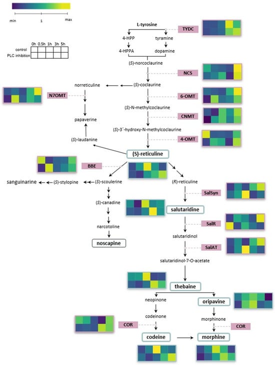 According to Pathak et al. (2013), (S)-coclaurine seems to be a primary branchpoint intermediate and preferred route for papaverine biosynthesis, rather than (S)-reticuline [24]. Therefore, our research focused on the expression of N7OMT, involved in the (S)-coclaurine pathway. Our results showed that N7OMT transcription was induced 3–5 h after wounding in untreated plants (Figure 2C). On the contrary, inhibition of PLC and subsequent wounding led to significant downregulation of N7OMT compared to untreated wounded plants. This difference is the most markable among all analysed transcripts, highlighting a regulatory connection between PLC activity and papaverine biosynthesis. Papaverine is difficult to detect in certain plants that are only a few weeks old. Even in our study papaverine was not detectable in intact plants as well as after wounding. However, Mishra et al. (2013) reported an increase in papaverine concentration 5 h post wounding in leaves of 130-day opium poppy plant compared to unwounded tissue [22], which supports our data, showing an up-regulation of N7OMT transcript 5 h after wounding only in untreated plants.
