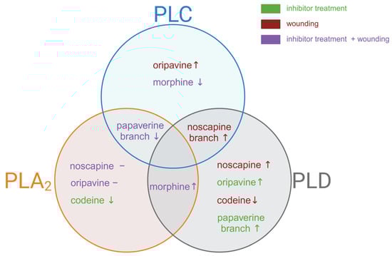 The diagram illustrates the distinct and overlapping effects of inhibition of phospholipases (PLC, PLA2, and PLD) on the alkaloid biosynthesis pathway and corresponding gene in opium poppy. The symbols “↑” and “↓” represent an increase and decrease, respectively, and the symbol “–” represents no changes in alkaloid levels or corresponding biosynthetic branch.