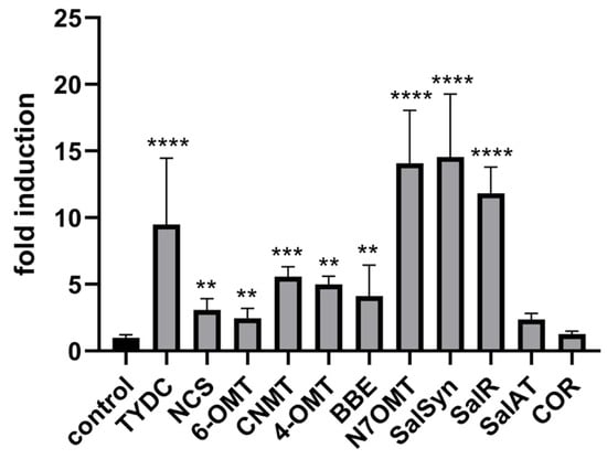 Changes in relative gene expression of selected enzymes of BIA pathway following MeJA treatment in opium poppy (Papaver somniferum L.). Bar graphs represent fold changes normalised to the untreated control (set to 1). β-actin and EF1α were used as reference genes. Statistically significant differences are indicated by * (** p < 0.01, *** p < 0.001, **** p < 0.0001).