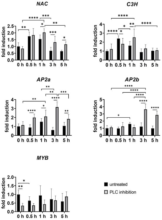 Temporal changes in relative gene expression of selected TFs following PLC inhibition in opium poppy (Papaver somniferum L.). Bar graphs represent fold changes normalised to the untreated and unwounded control at the time point set as 0 h (set to 1). The x-axis represents wounded plants, both untreated (black bars) and treated with PLC inhibitor (grey bars), collected at different time points (0.5 h, 1 h, 3 h, and 5 h). Unwounded plants treated with PLC inhibitor (0 h) are shown for comparison to the untreated and unwounded control (0 h). β-actin and EF1α were used as reference genes. Selected statistically significant differences are indicated by * (* p < 0.05, ** p < 0.01, *** p < 0.001, **** p < 0.0001).