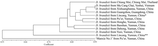 Based on NTSYS v.2.10e software, the genetic similarity coefficient was calculated using the SM coefficient, and a UPGMA tree was constructed based on the genetic similarity coefficient. Similarly, as reported in Result 2.5, we conducted cluster analysis using a representative sample from each population. The analysis revealed that the new variety ‘Manxie No. 1’ exhibited a certain degree of genetic divergence compared with D. brandisii, with a mean genetic similarity coefficient of 0.3823, indicating a relatively distant genetic relationship. This finding is congruent with the fact that ‘Manxie No. 1’ is a superior variety obtained through artificial selection. In the case of D. brandisii, the samples from Lincang** (Linxiang District) and Yuxi City in Yunnan Province, China, demonstrated a more distant genetic relationship with the other nine provenances. The remaining nine provenances of D. brandisii could be approximately divided into two groups based on the clustering tree. The samples from Baoshan City and Dehong Dai and Jingpo Autonomous Prefecture (abbreviated as ‘Dehong’ in the following text), which are geographically adjacent to each other in Yunnan Province, China, constituted one group, with a genetic similarity coefficient of 0.7292 between them. In the other group, the samples from Chiang Mai, Thailand, formed a separate subgroup, while those from Mu Cang Chai County, Vietnam, Xishuangbanna Dai Autonomous Prefecture (the following text is abbreviated as ‘Xishuangbanna’) and Lincang* (Cangyuan County) in Yunnan Province, China, and Guangzhou in Guangdong Province, China, were grouped together. Among them, the samples from Mu Cang Chai County, Vietnam, and Xishuangbanna, China, exhibited the closest genetic relationship, with a genetic similarity coefficient of 0.8667. The samples from Pu’er City and Honghe Hani, and Yi Autonomous Prefecture (abbreviated as ‘Honghe’ in the following text), which are geographically adjacent to each other in Yunnan Province, China, constituted the third subgroup, with a genetic similarity coefficient of 0.7826 (Figure 5; Table S5). The clustering results indicate that there was a certain correlation between the genetic relationships of different geographical provenances of D. brandisii and their geographical distribution. However, it was not completely related to their geographical distribution. Further verification of the accuracy of the UPGMA tree was carried out through the Cophenetic values subroutine in the clustering program and the matrix comparison plot subroutine in the graphics program. The matrix correlation r value of the correlation test was 0.9424, proving that the reliability of the UPGMA tree was very high.