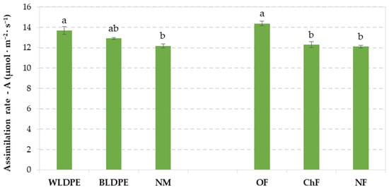 CO2 assimilation rate in Bologna perennial wall–rocket leaves under the individual influence of mulching and fertilization regimes. The values are presented as the means ± standard errors from three independent replications. Different lowercase letters indicate significant differences between groups at p ≤ 0.05 according to Duncan’s test, with ‘a’ representing the highest value. WLDPE—white polyethylene film; BLDPE—black polyethylene film; NM—nonmulched; OF—organic fertilization; ChF—chemical fertilization; NF—nonfertilized.