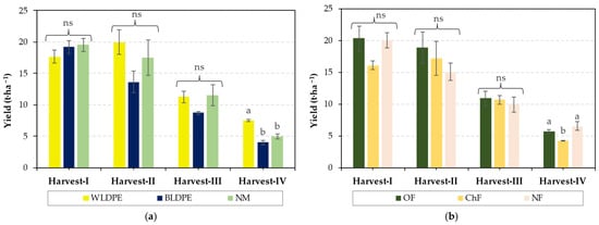 Harvest dynamics under the individual influence of (a) mulching and (b) fertilization regimes. The values are presented as the means ± standard errors from three independent replications. ns denotes nonsignificant differences, while different lowercase letters (a,b) at the same harvest indicate significant differences between groups at p ≤ 0.05 according to Duncan’s test, with ‘a’ representing the highest value. WLDPE—white polyethylene film; BLDPE—black polyethylene film; NM—nonmulched; OF—organic fertilization; ChF—chemical fertilization; NF—nonfertilized.