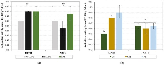 Individual effects of (a) mulching and (b) fertilization treatments on antioxidant activity in Bologna perennial wall–rocket leaves. The values are presented as the means ± standard errors from three independent replications. ns denotes nonsignificant differences, while different lowercase letters within the same antioxidant activity parameter indicate significant differences between groups at p ≤ 0.05 according to Duncan’s test, with ‘a’ representing the highest value. WLDPE—white polyethylene film; BLDPE—black polyethylene film; NM—nonmulched; OF—organic fertilization; ChF—chemical fertilization; NF—nonfertilized.