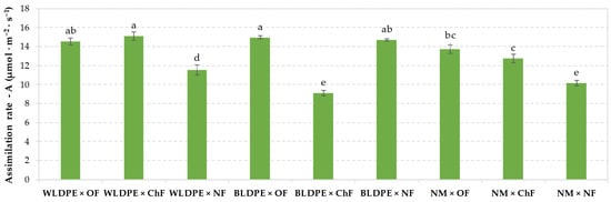 Effects of factor interactions on the CO2 assimilation rate in Bologna perennial wall–rocket leaves. The values are presented as the means ± standard errors from three independent replications. Different lowercase letters indicate significant differences between groups at p ≤ 0.05 according to Duncan’s test, with ‘a’ representing the highest value. WLDPE—white polyethylene film; BLDPE—black polyethylene film; NM—nonmulched; OF—organic fertilization; ChF—chemical fertilization; NF—nonfertilized.