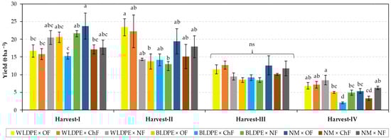 Influence of factor interactions on harvest dynamics of Bologna perennial wall–rocket. The values are presented as the means ± standard errors from three independent replications. ns denotes nonsignificant differences, while different lowercase letters at the same harvest indicate significant differences between groups at p ≤ 0.05 according to Duncan’s test, with ‘a’ representing the highest value. WLDPE—white polyethylene film; BLDPE—black polyethylene film; NM—nonmulched; OF—organic fertilization; ChF—chemical fertilization; NF—nonfertilized.