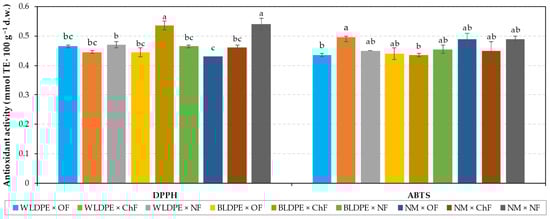 The results of the antioxidant activity analyses presented in Figure 6 indicated that the highest activity, as determined by the DPPH test, was detected in BLDPE × ChF and NM × NF variants, values that were significantly higher than those detected in the other variants (0.54 mmol TE 100 g−1 d.w.). In contrast, the lowest value was recorded for the interaction between non-mulched and organic fertilization (0.43 mmol TE 100 g−1 d.w.). Concerning the antioxidant activity assessed through the ABTS test, the findings revealed that the highest value for the WLDPE × ChF variant (0.50 mmol TE 100 g−1 d.w.) was significantly different only in comparison to the WLDPE × OF and BLDPE × ChF variants, which registered values of 0.43 mmol TE 100 g−1 d.w.