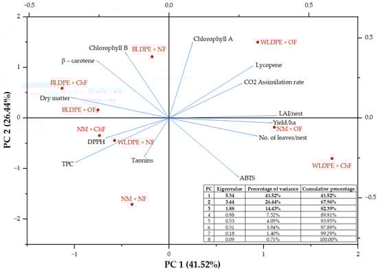 The results of the principal component analysis (PCA) applied to the entire dataset, illustrated in Figure 7, revealed that three of the eight independent principal component axes had eigenvalues greater than 1. The eigenvalues of PC1 and PC2 were 5.34 and 3.44, respectively, and these two principal components together accounted for 67.96% of the total variability, indicating that the majority of the information regarding the growth and quality traits of perennial wall–rocket under the influence of mulching and fertilization regimes was captured by these two components. PC1 was strongly associated with yield (0.370), number of leaves (0.383), β-carotene (0.370), and chlorophyll b (0.301), indicating that it represents a productivity-related axis, reflective of vegetative growth and nutritional quality. In contrast, its negative contributors—LAI (−0.352), CO2 assimilation rate (−0.336), TPC (−0.227), and lycopene (−0.259)—suggest a potential trade-off between yield-related traits and stress response or antioxidant properties under less favorable conditions. PC2 was defined by positive loadings for tannins (0.475), chlorophyll a (0.414), lycopene (0.360), and chlorophyll b (0.327), and negative contributions from DPPH (−0.371), ABTS (−0.243), and CO2 assimilation rate (−0.277), highlighting its relevance to antioxidant and pigment variability (Table 7).