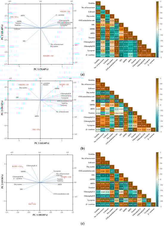 PCA score plot and Pearson correlation diagram showing the variation in growth and quality traits of perennial wall–rocket under the influence of (a) nonfertilized, (b) organic fertilization, and (c) chemical fertilization regimes.