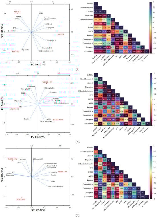 To better understand the effects of fertilization and mulching practices, PCA was conducted along with Pearson correlation analysis on subsets of data grouped by the type of fertilization regime or mulch used. The findings from these analyses, illustrated in Figure 8 and Figure 9, indicated that changes in fertilizer type or mulching practices have distinct effects on the measured variables, as they are positioned in different quadrants. For example, in the nonfertilized variants, the absence of mulch increased the contents of tannins and antioxidant compounds, measured as ABTS and DPPH. In contrast, the plants grown with the BLDPE mulch presented a relatively high CO2 assimilation rate and chlorophyll a, chlorophyll b, lycopene, and β−carotene contents, whereas those grown with the WLDPE mulch presented increased TPC contents in the leaves. Under organic fertilization, the highest levels for most of the analyzed traits were associated with WLDPE mulch. Chemical fertilization combined with BLDPE increased the dry matter content; DPPH, chlorophyll a, chlorophyll b, and β-carotene contents; and, in combination with WLDPE, the yield, number of leaves per plant, leaf area, CO2 assimilation rate, ABTS content, tannin content, and lycopene content increased (Figure 8c). Overall, the PCA results revealed that perennial wall–rocket experienced the greatest oxidative stress under the nonfertilization regime, regardless of the mulching practice. Additionally, the nonfertilization regime combined with WLDPE and BLDPE mulching is detrimental to perennial wall–rocket yield.