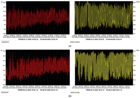 Trends of the temperature and relative humidity inside the polytunnel during the experiments in (a) 2022 and (b) 2023.