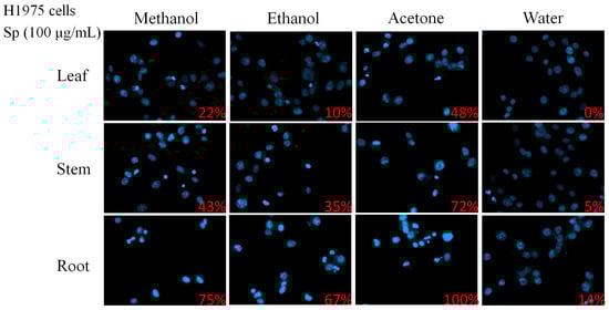 The cytotoxic effects of Sp extracts on apoptosis induction in H1975 cells. The chromatin condensation assay using Hoechst staining was performed to assess DNA fragmentation, which is a key hallmark of apoptosis. H1975 cells were treated with different Sp extracts (100 μg/mL), incubated for 24 h, and stained with Hoechst dye before imaging using an inverted fluorescence microscope. The pro-apoptotic activity of Sp extracts was observed in the following order: roots > stems > leaves. The choice of solvent significantly influenced the cytotoxic potential, with acetone-extracted fractions exhibiting the highest apoptosis induction. Notably, the water extracted from leaves did not induce apoptosis in H1975 cells.