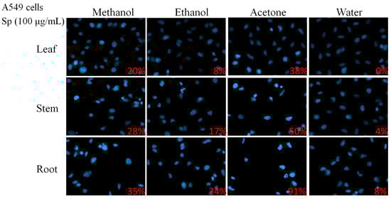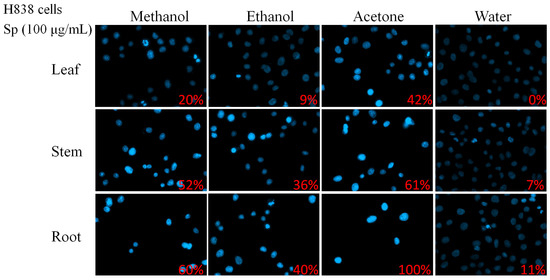 The cytotoxic effects of Sp extracts on apoptosis induction in H838 cells. The chromatin condensation assay was conducted to evaluate DNA fragmentation, which is a hallmark of apoptosis. H838 cells were treated with different Sp extracts (100 μg/mL), incubated for 24 h, and stained with Hoechst dye before imaging using an inverted fluorescence microscope. The pro-apoptotic activity of Sp extracts was observed in the following order: roots > stems > leaves and acetone > methanol > ethanol > water. The water extracted from leaves did not induce apoptosis in H838 cells.