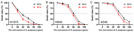 Lung cancer remains a leading cause of cancer-related mortality worldwide, accounting for approximately 1.8 million deaths annually [20]. Non-small-cell lung cancer (NSCLC), which constitutes around 85% of all lung cancer cases, is conventionally treated with surgery, chemotherapy, radiation therapy, and targeted therapies [21,22]. However, single-agent treatments often drive cancer cells to activate alternative survival pathways, ultimately leading to drug resistance [23,24,25]. Notably, therapy resistance accounts for nearly 90% of cancer treatment failures and contributes to 80–90% of cancer-related deaths [26]. Therefore, the integration of multiple chemotherapeutic agents, including natural compounds, is a promising strategy for overcoming resistance and identifying alternative therapeutic approaches for lung cancer treatment [27,28,29]. Natural products have emerged as a valuable resource for drug discovery, with more than 30% of all U.S. Food and Drug Administration (FDA)-approved drugs being either natural products or their derivatives [30,31,32]. Given this potential, we investigated the cytotoxic effects of various S. purpurea extracts, prepared using different solvents, on NSCLC cell survival, migration, proliferation, and apoptosis in A549, H838, and H1975 cells. Additionally, the acetone-extracted root fraction (Sp-R-A) enhanced the cytotoxic effect when combined with the clinically approved anti-lung cancer drug afatinib, suggesting a potential synergistic interaction.