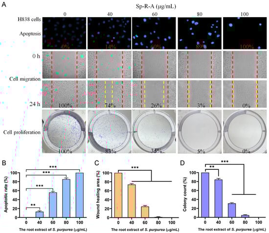 The anticancer potential of Sp-R-A in H838 cells. (A) The effects of Sp-R-A (0–100 μg/mL) on nuclear condensation, cell migration, and cell proliferation in H838 cells. (B) Hoechst staining demonstrating apoptosis and DNA fragmentation at varying concentrations of Sp-R-A. (C) Wound healing assay showing the migration capacity of H838 cells treated with different concentrations of Sp-R-A. Images were taken at 0 h and 24 h post-treatment. (D) Clonogenic assay evaluating the proliferative and colony-forming ability of H838 cells following treatment with Sp-R-A. Statistical significance is indicated as ** for p < 0.01 and *** for p < 0.001 compared to the control group.