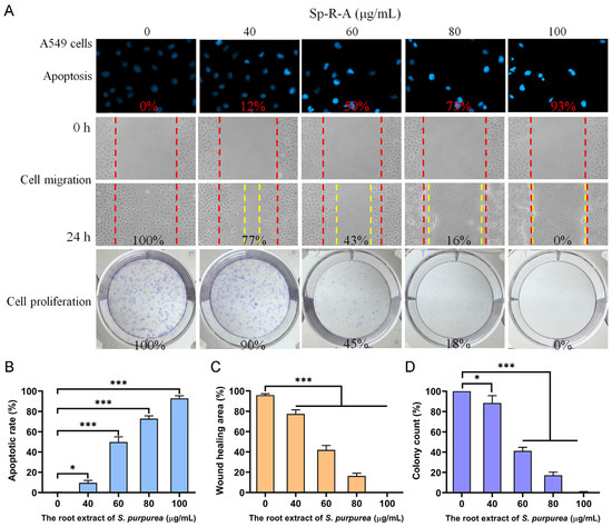 The anticancer potential of Sp-R-A in A549 cells. (A) The effects of Sp-R-A (0–100 μg/mL) on nuclear condensation, cell migration, and cell proliferation in A549 cells. (B) Hoechst staining demonstrating apoptosis and DNA fragmentation at varying concentrations of Sp-R-A. (C) A wound-healing assay showing the migration capacity of A549 cells treated with different concentrations of Sp-R-A. Images were taken at 0 h and 24 h post-treatment. (D) A clonogenic assay evaluating the proliferative and colony-forming ability of A549 cells following treatment with Sp-R-A. Statistical significance is indicated as * for p < 0.05 and *** for p < 0.001 compared to the control group.