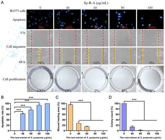 The anticancer potential of Sp-R-A in H1975 cells. (A) The effects of Sp-R-A (0–100 μg/mL) on nuclear condensation, cell migration, and cell proliferation in H1975 cells. (B) Hoechst staining demonstrating apoptosis and DNA fragmentation at varying concentrations of Sp-R-A. (C) A wound-healing assay showing the migration capacity of H1975 cells treated with different concentrations of Sp-R-A. Images were taken at 0 h and 48 h post-treatment. (D) A clonogenic assay evaluating the proliferative and colony-forming ability of H1975 cells following treatment with Sp-R-A. Statistical significance is indicated as *** for p < 0.001 compared to the control group.