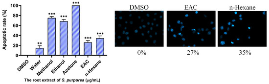 Apoptosis in cancer cells was assessed using the Hoechst 33342 staining method [104]. The selected cells were seeded in 96-well plates at a density of 5 × 103 cells per well and allowed to adhere for 16 h before being incubated with the extract for 24 h. Following incubation, the cells were washed with PBS and stained with Hoechst dye (1 μg/mL) in the dark for 10 min. Stained cells were then imaged using the ImageXpress Pico system (Molecular Devices, San Jose, CA, USA) equipped with DAPI filter cubes.