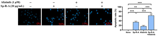 The synergistic effect of Sp-R-A and afatinib on apoptosis in H1975 cells. The combined effect of Sp-R-A (20 μg/mL) and afatinib (1 μM) on apoptosis in H1975 cells was evaluated using Hoechst staining. The results indicate that co-treatment with afatinib and Sp-R-A significantly enhances apoptosis, suggesting a potential synergistic therapeutic strategy against lung cancer. Statistical significance is indicated as ** for p < 0.01 and *** for p < 0.001 compared to the control group.