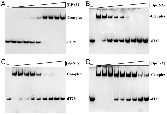 A biotinylated dT25 was used as a standard assay substrate to analyze huRPA32 binding via the LightShift Chemiluminescent EMSA Kit [102]. Purified huRPA32 was incubated with ssDNA (30 fmol/μL) at varying concentrations (0, 0.31, 0.63, 1.25, 2.5, 5, 10, 20, 40, and 50 μM). The huRPA32–dT25 mixtures were incubated for 60 min at 37 °C in a buffer containing 40 mM Tris–HCl (pH 7.5) and 50 mM NaCl. After the addition of the dye mixture, the reaction samples were resolved on 8% native polyacrylamide gel. Electrophoresis was performed at 100 V for 1 h in a TBE running buffer. The protein–DNA complexes were subsequently transferred onto a positively charged nylon membrane (GE, Boston, MA, USA) via electroblotting. The cross-linking of the transferred DNA to the membrane was carried out using a UV-light instrument equipped with 312 nm bulbs, with an exposure time of 10 min. DNA detection was performed using a streptavidin–horseradish peroxidase conjugate and a chemiluminescent substrate (Pierce Biotechnology, Waltham, MA, USA).