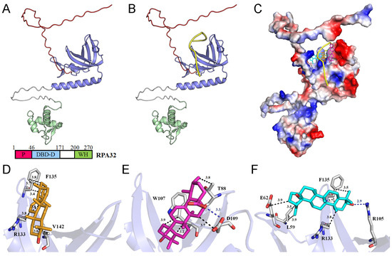 AlphaFold prediction of huRPA32 structure and molecular docking of potential inhibitors. (A) AlphaFold 3.0 prediction of the full-length huRPA32 structure based on its amino acid sequence. The protein domains are color-coded: the P domain is shown in red; the DBD-D domain is shown in blue; and the WH domain is shown in green. The ssDNA-binding site is known to be located within the DBD-D domain. (B) The AlphaFold prediction of huRPA32 in complex with ssDNA dT10 and ssDNA depicted in yellow. (C) The docking analysis of the three compounds with the highest binding affinity, as determined by AutoDock Vina: α-amyrin (light orange), ursolic acid (light magenta), and betulinaldehyde (cyan). These compounds target different ssDNA-binding sites in huRPA32, potentially hindering its ability to bind ssDNA. The charge distribution pattern is shown to highlight the predicted ssDNA-binding sites. (D) The binding mode of α-amyrin. α-Amyrin is positioned within the ssDNA-binding cavity and interacts hydrophobically with Arg133, Phe135, and Val142 of huRPA32. The numbers within the black dashed lines indicate the interaction distances. (E) The binding mode of ursolic acid. Ursolic acid forms a hydrogen bond with Asp109 and engages in hydrophobic interactions with Thr88, Trp107, and Asp109. (F) Binding mode of betulinaldehyde. Betulinaldehyde establishes a hydrogen bond with Arg105 and interacts hydrophobically with Leu59, Glu62, Arg133, and Phe135.