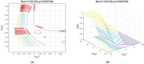 Grid search parameter c and g process: (a) Contour maps; (b) Three-dimensional view.