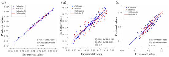 Figure 2 displays the scatter plots of the chemical values and predicted values from the optimal prediction model for crop straw lignocellulose. Figure 2a shows a scatter plot of the PLS prediction model for cellulose content. Figure 2b illustrates a scatter plot for the PLS prediction model for hemicellulose. Finally, Figure 2c presents a scatter plot for the PLS prediction model for lignin.